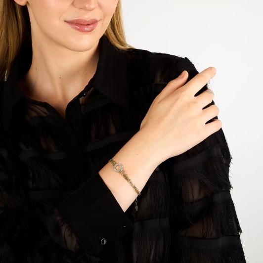 Браслет выполнен из высококачественной нержавеющей стали, покрытой роскошным IP-покрытием золотого цвета, которое придает ему теплое сияние и обеспечивает долговечность. Основа браслета состоит из двух тонких золотистых цепочек, соединенных вместе.