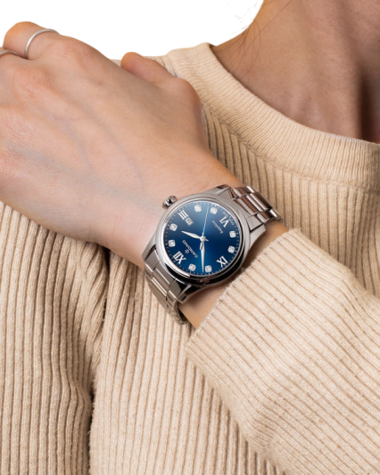 Корпус изготовлен из высококачественной нержавеющей стали, что обеспечивает долговечность и блеск. Изящный дизайн дополнен сапфировым стеклом, устойчивым к царапинам, которое надежно защищает циферблат. Браслет из нержавеющей стали идеально сочетается с корпусом, обеспечивая комфортное и надежное крепление на запястье. Раскладная застежка гарантирует удобство при надевании и снятии часов. Синий циферблат, который притягивает взгляд своей утонченностью. Тонкие стрелки и лаконичные метки дополняются окошком даты, добавляя практичности.